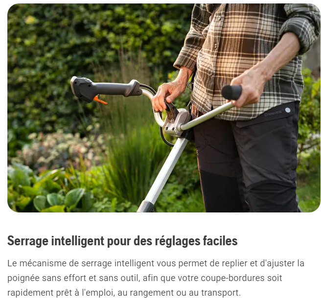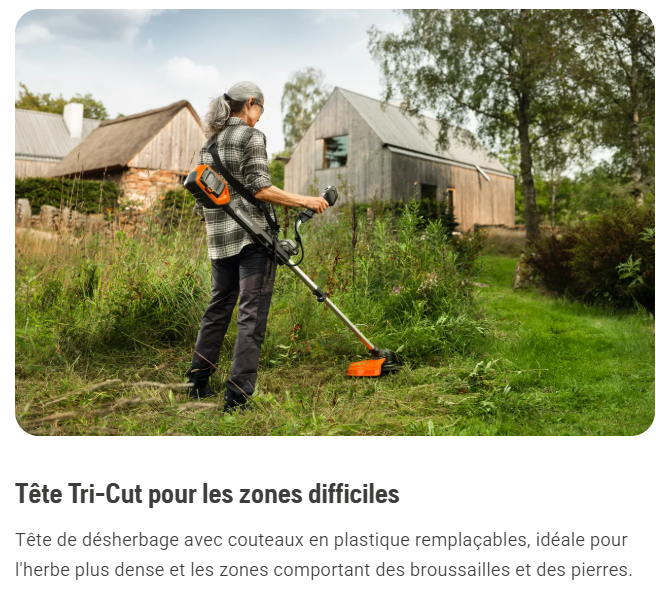 Le Husqvarna 220iR allie hautes performances et excellente ergonomie, ce qui en fait un coupe-bordures idéal pour les finitions dans et autour du jardin ainsi que le petit entretien de l'herbe haute. Sa poignée en forme de cornes de taureau, son manche télescopique et son harnais rembourré sont réglables, ce qui garantit une expérience utilisateur confortable et agréable, même pendant les longues périodes de travail. La commande de vitesse progressive vous permet également de régler la puissance en fonction de la tâche à accomplir. En plus de la tête de désherbage R25 pour une coupe efficace des bordures, une tête de désherbage Tri-Cut équipée de couteaux en plastique est incluse. Elle est idéale pour les travaux plus difficiles comme la coupe dans des zones envahies par la végétation à l'extérieur du jardin. Télescopique, le 220iR conviendra à toutes les morphologies, pour un confort optimal. Lorsque le coupe-bordures doit être remisé ou transporté, vous pouvez profiter du manche télescopique et de la poignée repliable pour le rendre très compact et facile à manipuler.